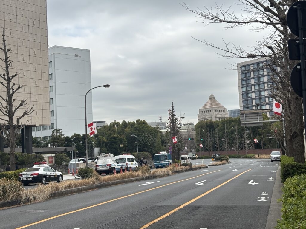 先に見えるのが国会議事堂で警察車両が並ぶ左側は自由民主党の本部です。